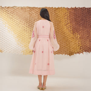 A baby pink dress with delicate wavy V-Neck, with hand embroidered Raglan sleeves in organza and a flowing skirt, like cherry blossoms on a spring day. This dress is crafted from handwoven cotton silk floral Jamdani weave technique.
