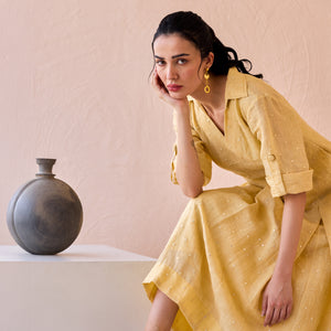 A refined silhouette in a soft mellow yellow, this ballerina-length linen dress is detailed with subtle mirror work reminiscent of scattered polka dots. Featuring a collared V-neckline and seamless box pleats at the waist for a clean, structured look. The mid-length trumpet sleeves with roll-up tabs add versatility, making it ideal for both relaxed and polished settings. Lightweight, breathable, and thoughtfully detailed—this is understated elegance made easy.