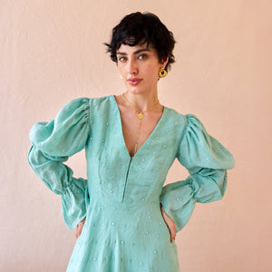 Crafted in a soothing pastel aqua, this maxi-length dress blends structure with softness. It features a flattering V-neckline with subtle herringbone stitch detailing at the cleavage, adding texture and finesse. The standout detail? Two-tiered full-length puffed sleeves that bring gentle volume and a romantic silhouette. The stylized back and center-back zipper offers a clean, modern finish, designed for both comfort and impact.