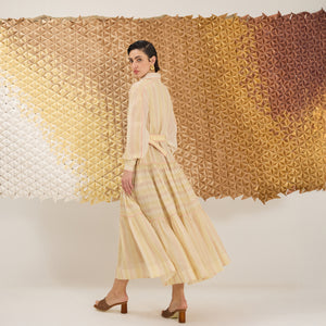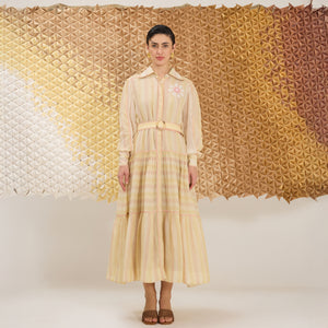 Crafted from hand woven Cotton Silk fabric this dress is a button down flowy dress with voluminous skirt resembling peony petals. Soft pastel shades like blush pink, pale white and soft peach create a romantic, ethereal vibe. Finished with a belt and hand embroidered flower this dress is an embodiment of grace and beauty.